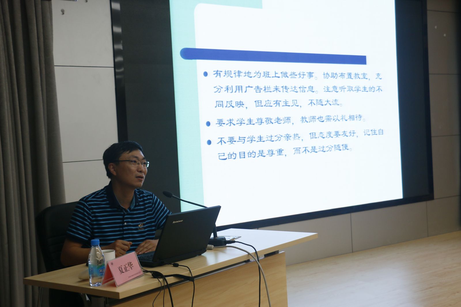 而来自于苏州市平江中学校学生处的蒋少鸿老师更以自己的切身教学管理经验为新入职教师们阐释了“立德树人”四个大字的真正涵义,同时也让新入职教师们理解了教师对于学生成长的重要性。他说,班级建设事关你我他,作为一名教师要始终关注集体中的每一个孩子,应用更广阔的视野来看待家校合作,使学生、教师、家长之间建立起互信合作关系,形成更为广泛的教育共同体,共同关心教育和孩子的发展。更为难得的是,讲座之中,蒋老师还细心地为新入职教师推荐了相应的书目和微信公众号,真正地做到了让新入职教师的教师专业成长有路可寻。