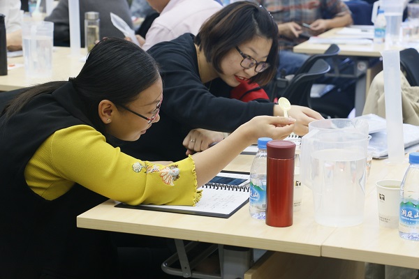 本次培训时间从10月13日到10月15日,课程内容主要包括如何通过探究式学习和课堂合作鼓舞和促进学生,介绍下一代科学标准和5E课堂模式,认知建模的作用等,采用分组实验、案例教学、两名外教协作教学模式,突出教学的自主性、实践性和有效性,注重提升教师的获得感。